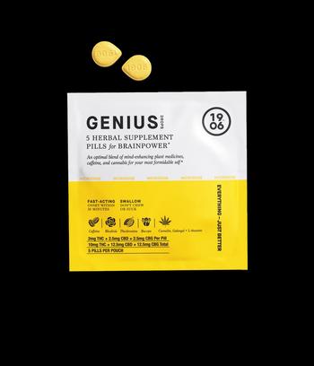 4 x 2.5mg THC + 2.5mg CBD + 2.5mg CBG. - Genius promotes cognitive performance through a blend of cannabis, caffeine, and five plant medicines. Swallowable pills with rapid onset of 20 minutes. Vegan, calorie-free, sugar-free, and gluten-free.