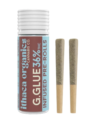Ithaca Organics Gorilla Glue (G. Glue) 2-pack pre-rolls are small-batch, bubble hash-infused, indica-dominant hybrid joints. Grown at a certified organic Finger Lakes family farm, they typically feature high potency (approx. 36% THC) and offer a strong, couch-locking effect with a sweet, sour, and diesel mocha